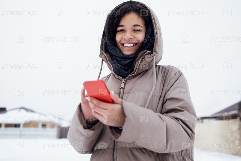 Молодая очаровательная африканская женщина в теплой повседневной одежде держит телефон