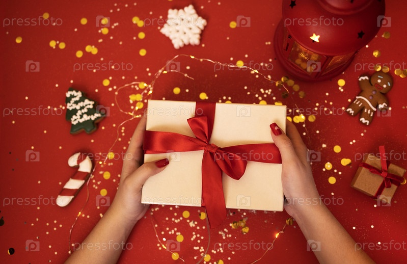 Женские руки с красным маникюром украшают подарочную коробку красной лентой и бантом