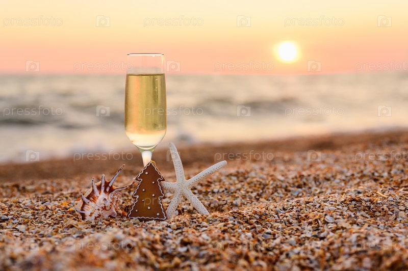 Бокал шампанского с ракушками и рождественская елка у моря на фоне заката. Селективный фокус. Концепция рождественских праздников