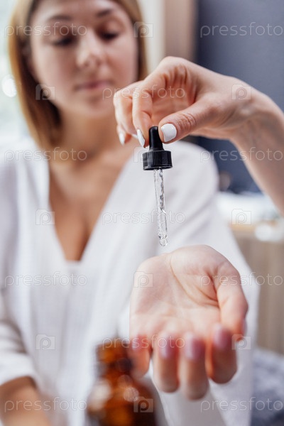 Крупным планом рука косметолога наносит сыворотку из пипетки на запястье клиентки в помещении