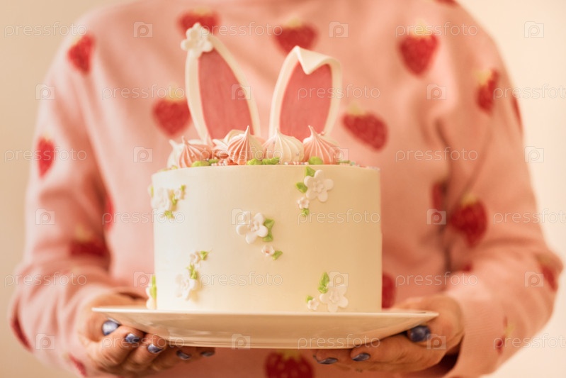 Крупный план женских рук среднего возраста с аккуратным маникюром держат детский торт