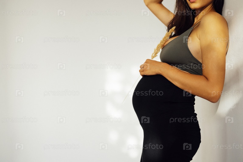 Красивая беременная женщина в темной одежде стоит боком у белой стены. Очаровательная брюнетка, ожидающая ребенка, положила руку на животик и держит колосок