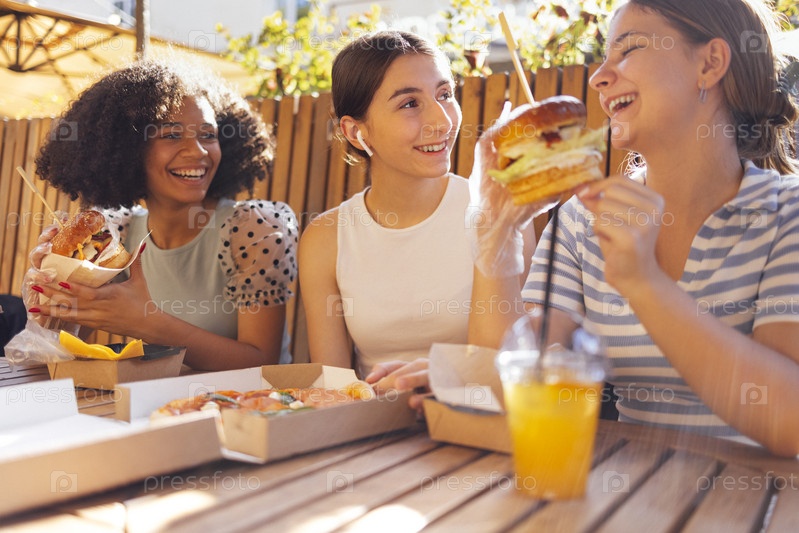 Симпатичные улыбающиеся девочки-подростки сидят в кафе под открытым небом и едят фаст-фуд