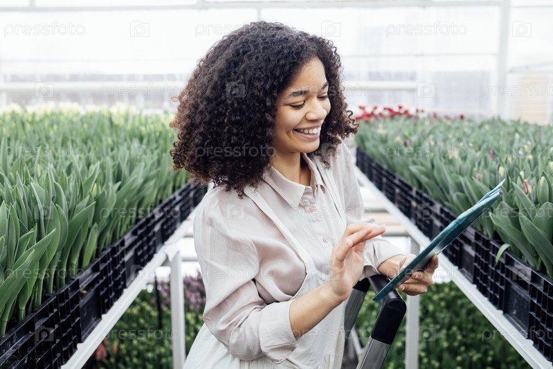 Молодая улыбающаяся женщина смешанной расы использует цифровой планшет для выращивания тюльпанов разных типов