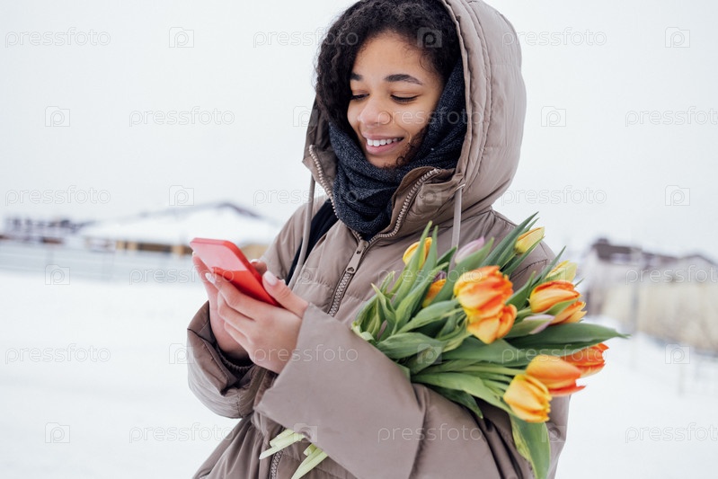 Молодая очаровательная африканская женщина в теплой повседневной одежде держит телефон и букет оранжевых тюльпанов