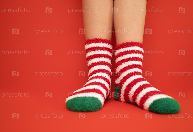 Женские ножки в пушистых новогодних или рождественских теплых носках. Цвет носков — красные и белые полосы, а также зеленые пятки и кончики. Ноги девушки на красном ярком фоне