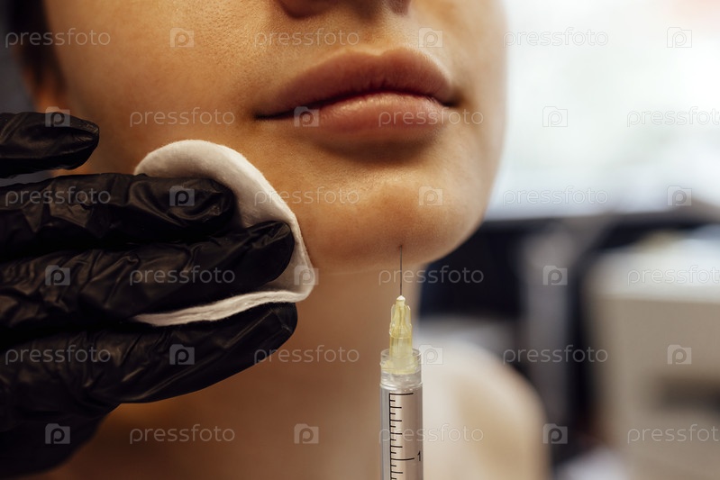 Женщина-косметолог в прозрачных перчатках делает укол в нижнюю челюсть своего клиента