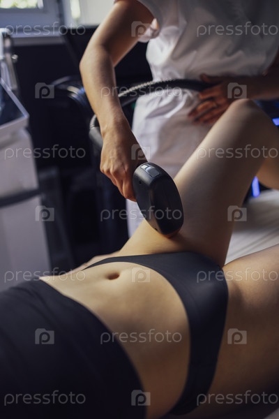 Молодая женщина получает фотоэпиляцию во время посещения центра красоты в салоне