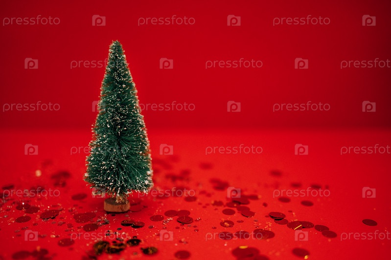 Стильная маленькая елочка на красном фоне. Яркий праздничный фон с серебряными блестками и золотыми круглыми конфетти