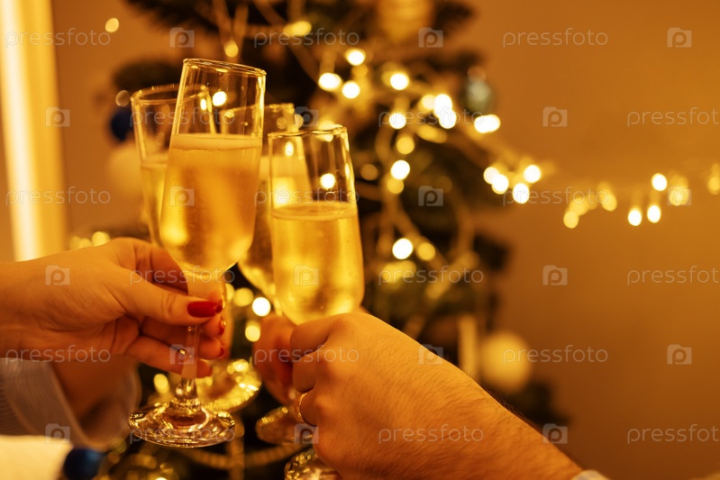 Женские и мужские руки держат бокалы с шампанским и щелкают ими
