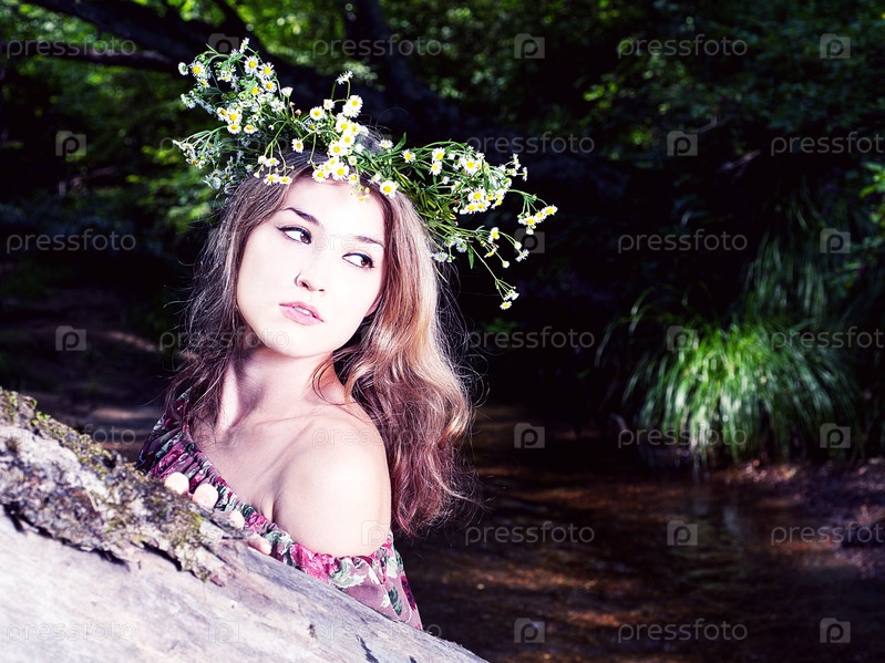 Портрет красивой девушки в цветастом платье и венке на свежем воздухе