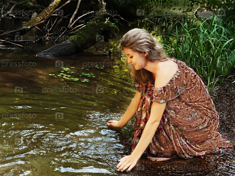 Красивая девушка в цветочном платье смотрит на свое отражение в воде. Мягкие солнечные цвета