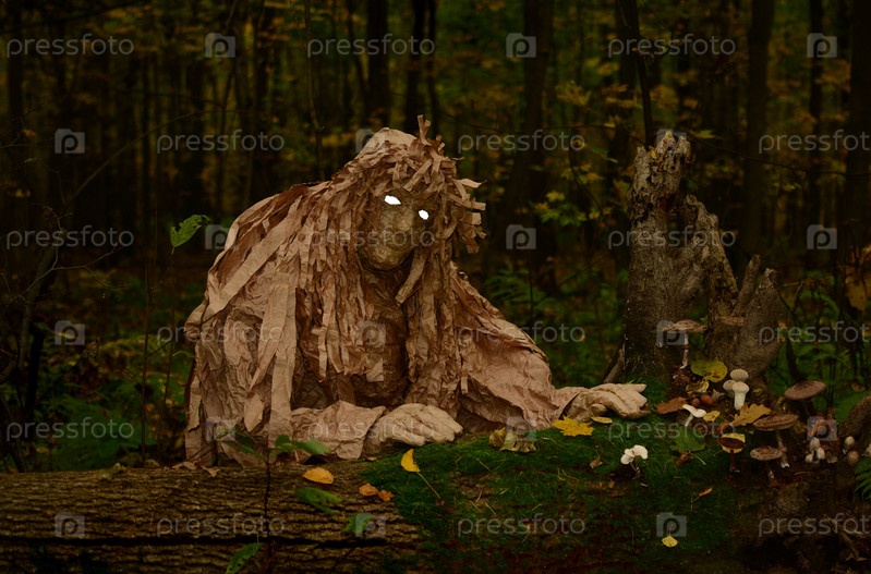 Лесной леший с белыми глазами. Страшное существо в темном лесу