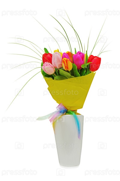 Букет красочных тюльпанов в белой вазе, изолированный на белом фоне