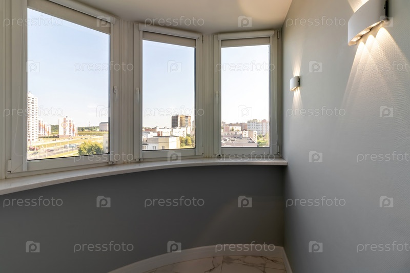 Современный интерьер лоджии белого цвета с подсветкой, столом и окном