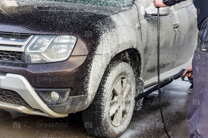 Мужчина моет свою машину.Мужчина в стиральной машине.Рено в пену на автомойке