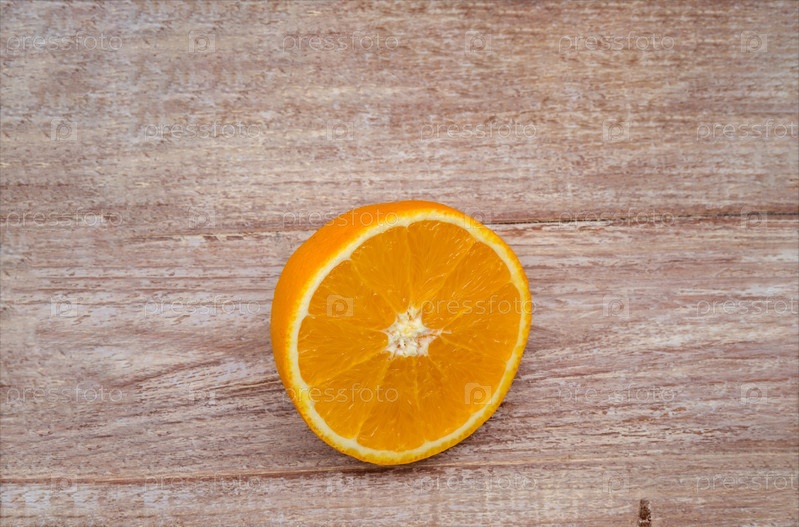 Половина апельсина на деревянном столе. Баннер с оранжевым. Апельсин на деревянном фоне