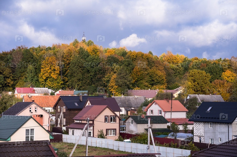Деревня возле леса. Новые частные дома. Красивый осенний лес и крыши домов