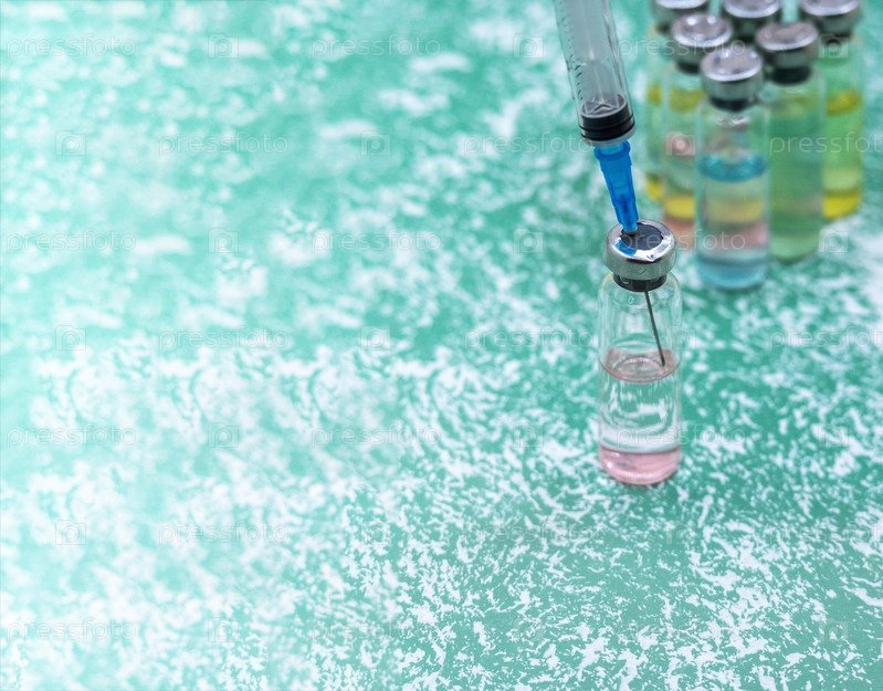 Медицинские ампулы, шприцы и маска на зеленом фоне. Вакцинация против ковид-19