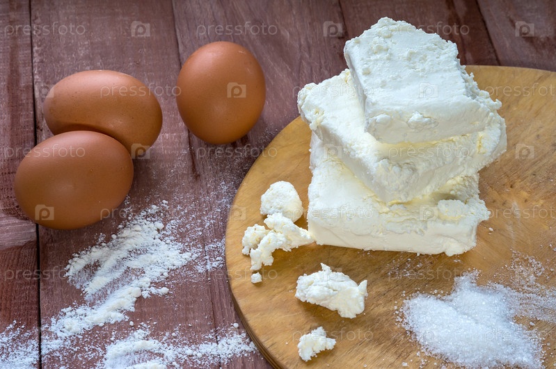 Творог и яйца на столе. Продукты для творожных тортов. Готовим творог