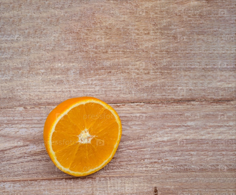 Половина апельсина на деревянном столе. Баннер с оранжевым. Апельсин на деревянном фоне