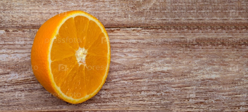Половина апельсина на деревянном столе. Баннер с оранжевым. Апельсин на деревянном фоне
