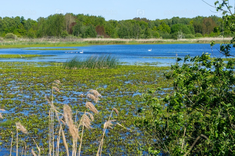 Летний пейзаж озера. Белые лебеди на лесном пруду