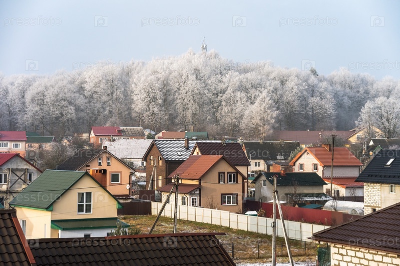 Деревня возле леса. Новые частные дома. Красивый зимний лес и крыши домов