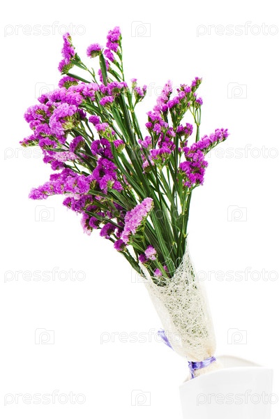 Букет фиолетового гвоздичника в вазе, изолированный на белом фоне