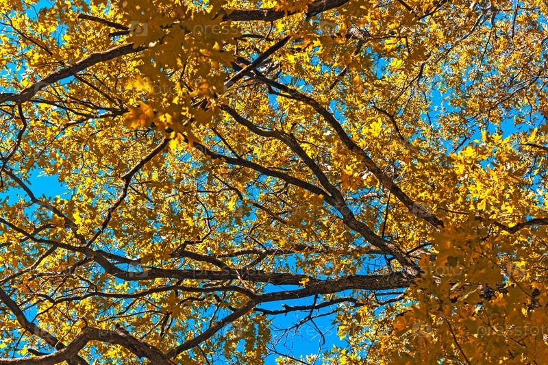 Желтые осенние листья на дубе на фоне голубого неба