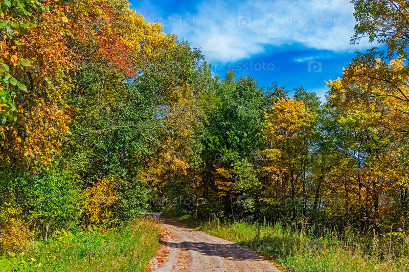 Сельский пейзаж с тропинкой в осеннем лесу