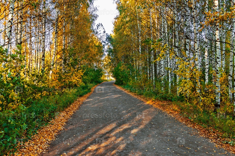 Сельский пейзаж с тропинкой в желтой березовой аллее
