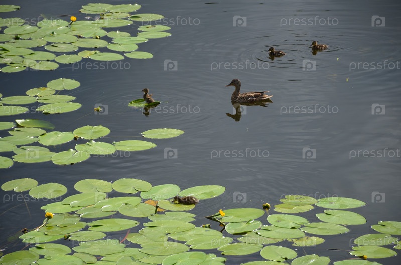 Утка с маленькими утятами лавает в пруду заросшему листьями водяной лилии, кувшики, кубышки
