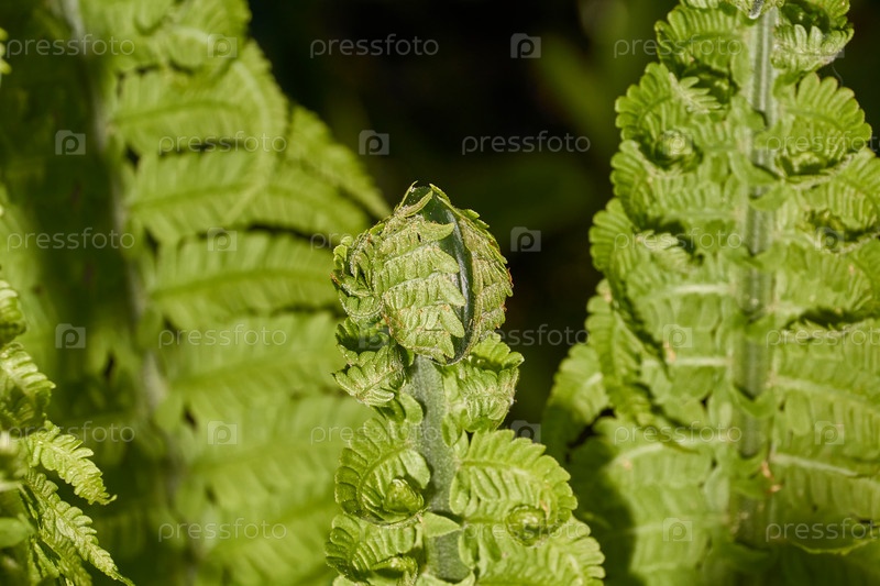 Листья папоротника раскрываются на клумбе в саду. молодой папоротник (лат. Polypodiophyta). весна