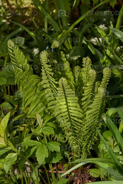 Листья папоротника раскрываются на клумбе в саду. молодой папоротник (лат. Polypodiophyta). весна