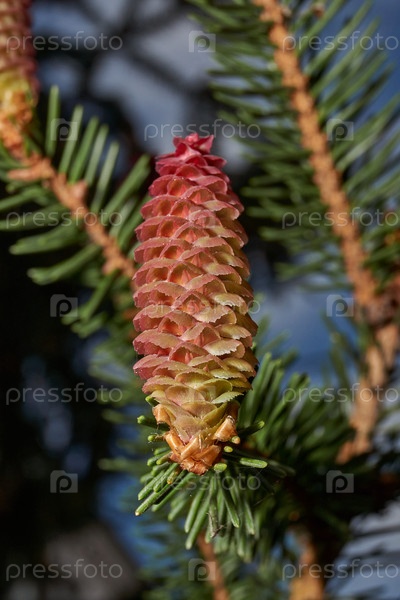 Женская еловая шишка в городском парке. Созревают еловые шишки. Весна