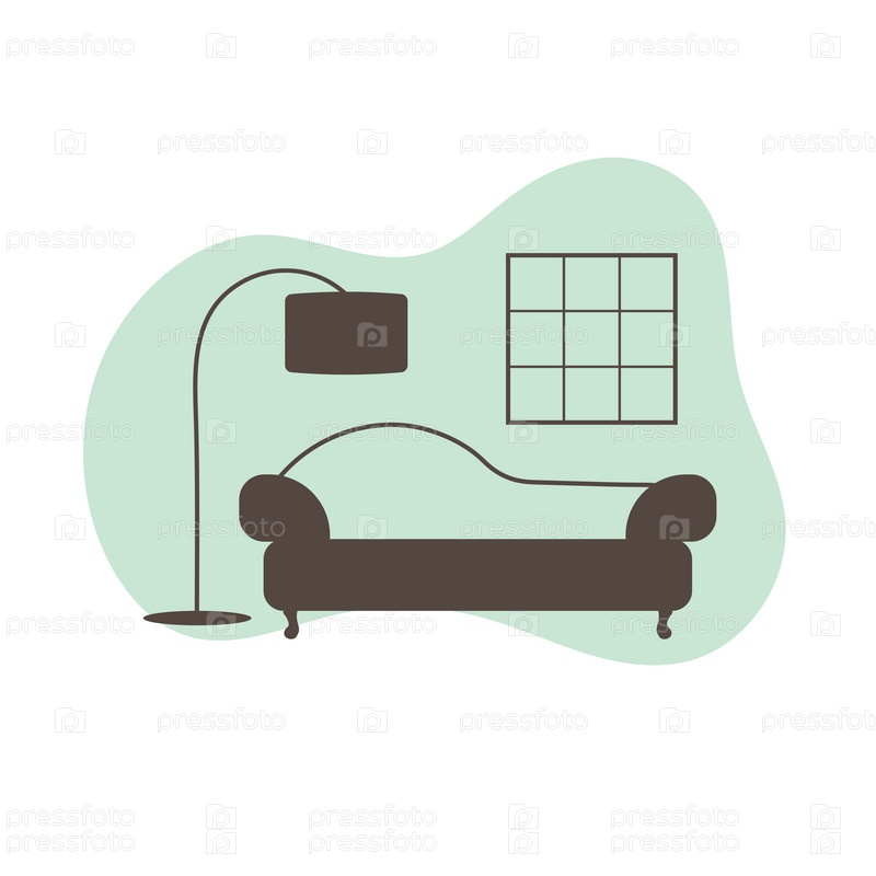 Гостиная с диваном и торшером. Интерьерная мебельная иконка в плоском стиле
