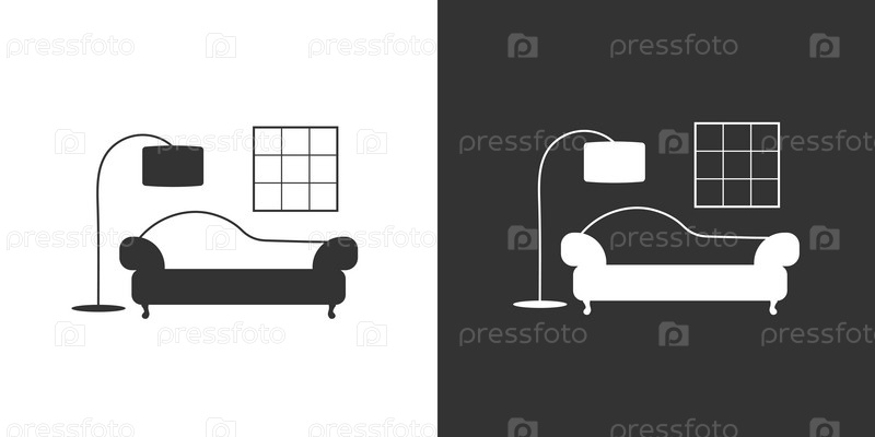 Фрагмент интерьера гостиной с диваном и торшером. Простая иконка на белом и черном фоне