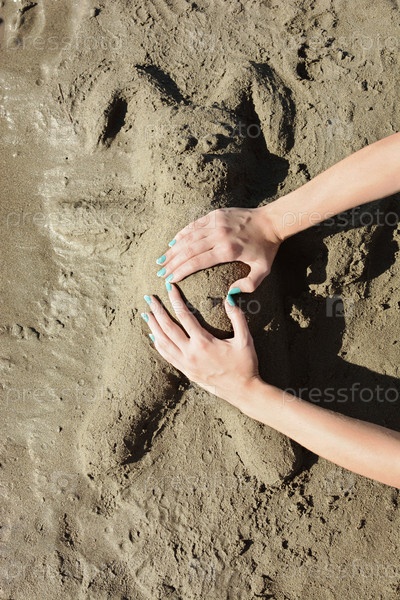 Игры в песке на пляже. Концепция беременности. Женские руки на животе зайца из песка