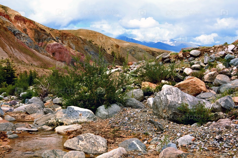 Красочный пейзаж гор на Алтае. Горная река на каменной земле. Сибирь. Россия