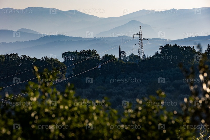 Италия. Терни. Горный итальянский пейзаж в провинции Умбрия. Линия электропередачи. Италия. Терни. Итальянский горный ландшафт в провинции Умбрия. Линия электропередач