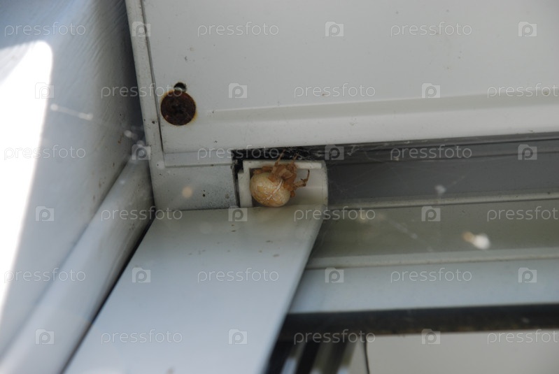 Большой белый паук в углу окна