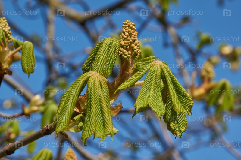 Распускаются бутоны цветков каштана и появляются соцветия. Весна