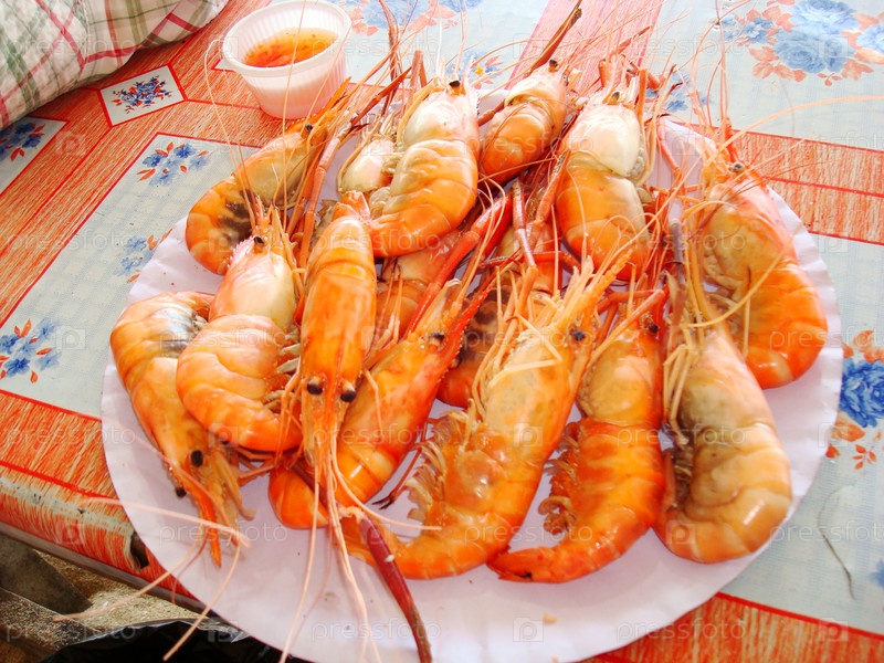 Большие речные креветки на тарелке