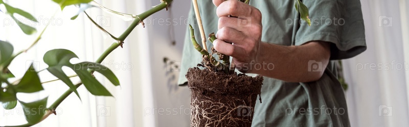 Баннерные руки держат побеги мини-монстров Rhaphidophora тетраспермы для сортировки, готовятся к посадке в глиняный цветочный горшок
