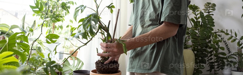 Баннерные руки держат побеги мини-монстров Rhaphidophora тетраспермы для сортировки, готовятся к посадке в глиняный цветочный горшок