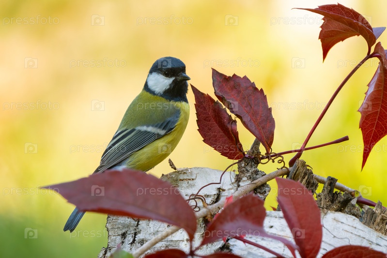 Птичья синица крупным планом на березовом пне среди красных осенних листьев