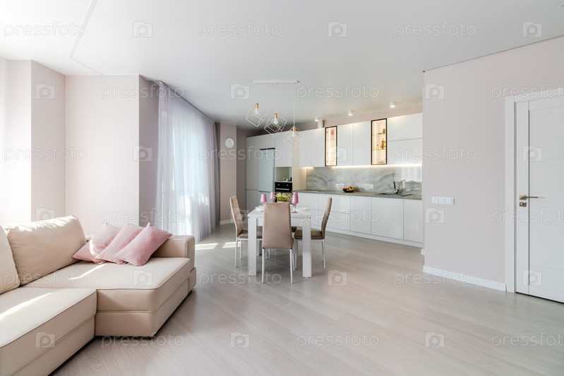 Современная гостиная, совмещенная с кухней, в светлых тонах. Обеденный стол с розовой посудой
