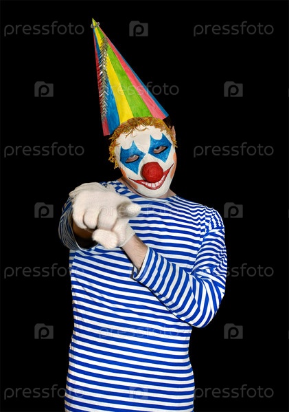 Мужчина в маске клоуна и в праздничной кепке указывает указательным пальцем на камеру. Изолированные на черном фоне