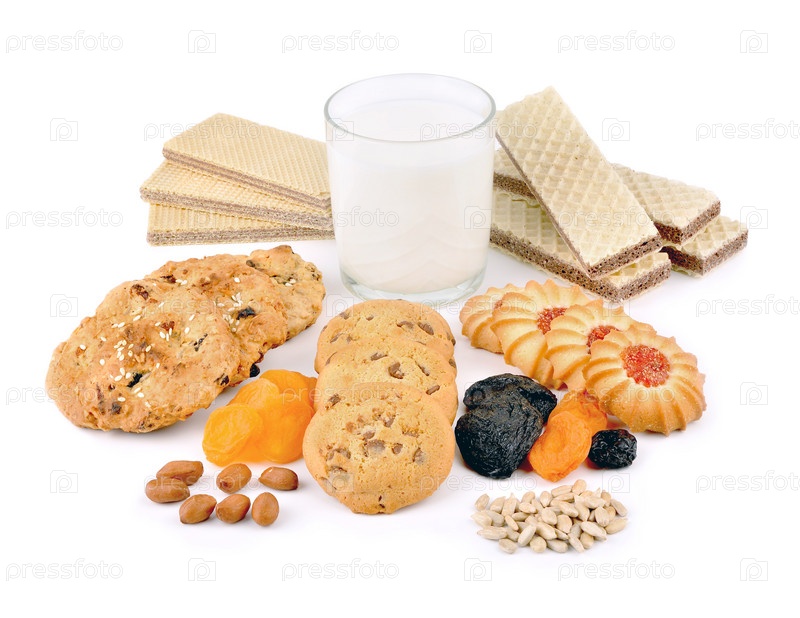 Вафли и овсяное печенье на белом фоне. Сладкие кондитерские изделия и стакан молока